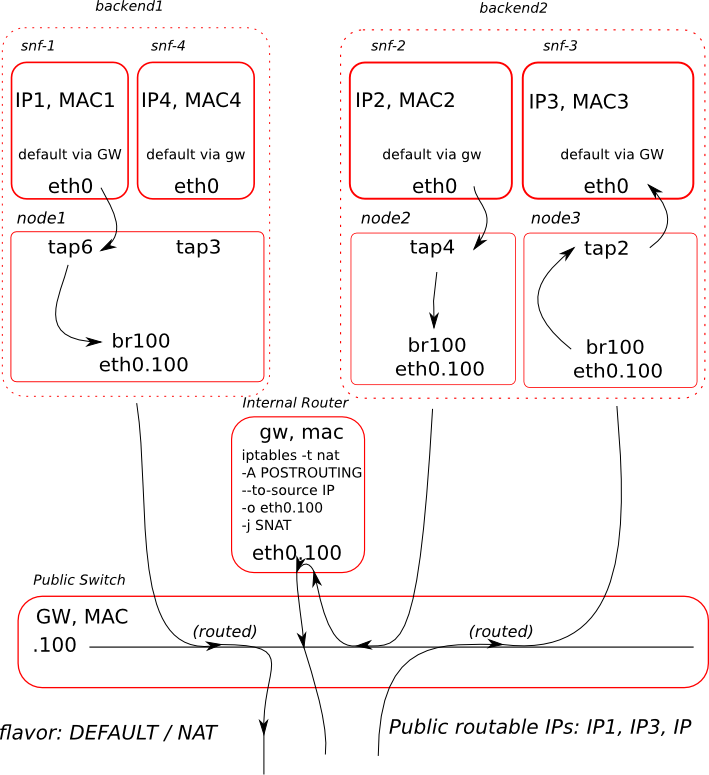• a routing table for the IP_LESS_ROUTED flavor (snf_public, see Fig. 4)